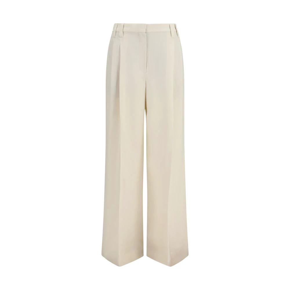 The wide Pants in fluid twill by Brunello Cucinelli are characterized by wide volumes and a straight leg, with double front pleats that define the tailored line the entire leg. The fine fluid twill is a fabric that is fluid yet structured, ensuring comfort and a regular fit. They feature a zip closure with metal hooks and a counter button, front American pockets, rear patch pockets, and a plain hem. The iconic nickel-free monili decoration by Brunello Cucinelli adds a distinctive detail. These trousers are elegant and suitable for business, formal, and smart casual outfits.