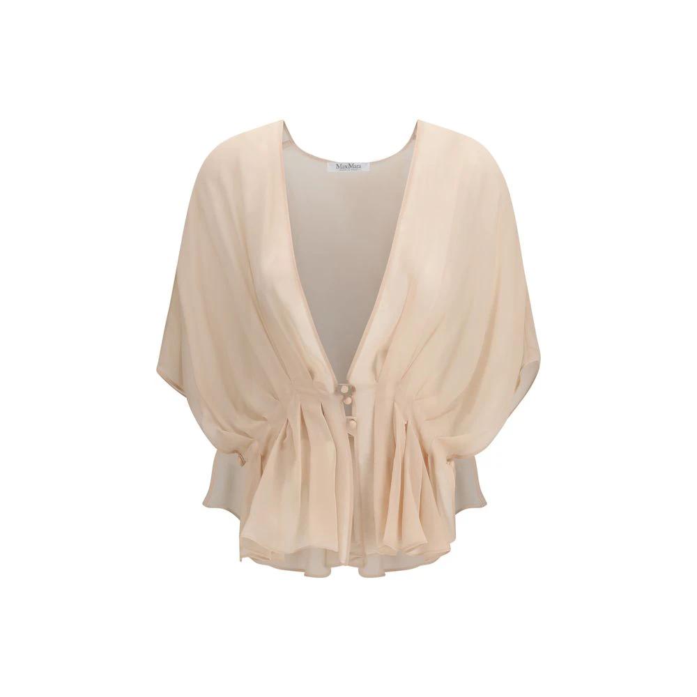The Cape-Style Silk Shirt by Max Mara delivers fluid and statement elegance. Crafted from semi-sheer silk, it features a deep V neckline that enhances the silhouette with refined allure. The three-button front closure and single button detail at the sleeves complete the design with subtle sophistication, creating graceful movement and a contemporary feel.