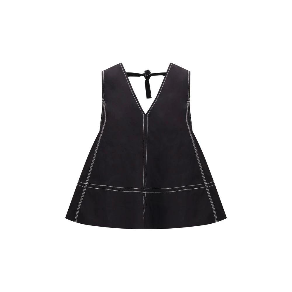 The Cotton A-line Top By Ganni elevates simplicity through a refined play of lines and structure. The V-neckline introduces a clean, effortless elegance, enhanced by contrast stitching that outlines the silhouette with graphic precision. At the back, the lowered opening is finished with a tied detail that brings softness and modern femininity. A piece that turns understatement into presence.