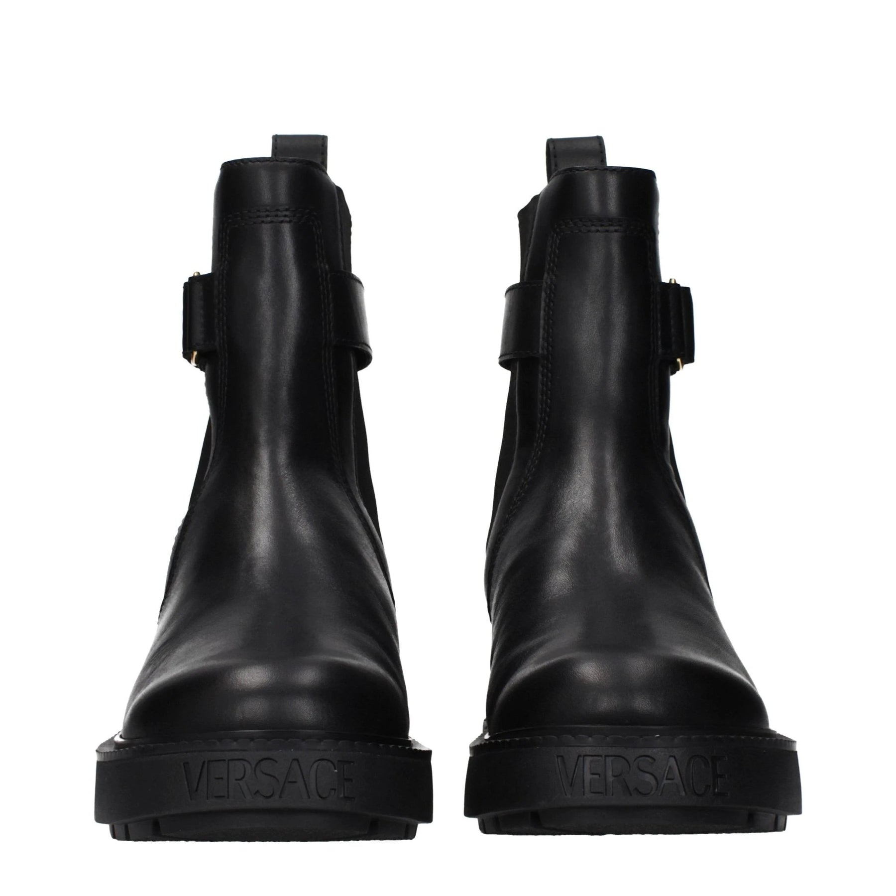 The product with MPN 10178721A127551B00V and code F86277 leather in black is a ankle boots designed by Versace. It has features like front logo, side logo, back detail.