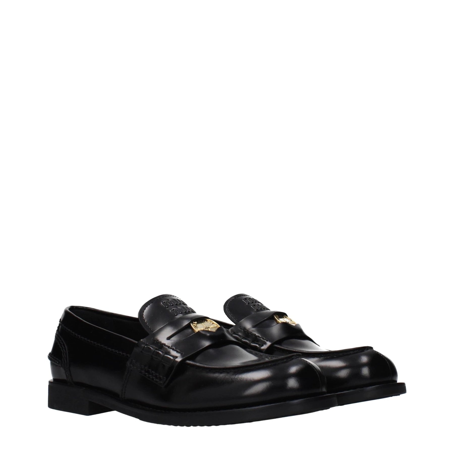 The product with MPN 5D773DULX020F0002 and code F84708 leather in black is a loafers designed by Miu Miu. It has features like front logo.