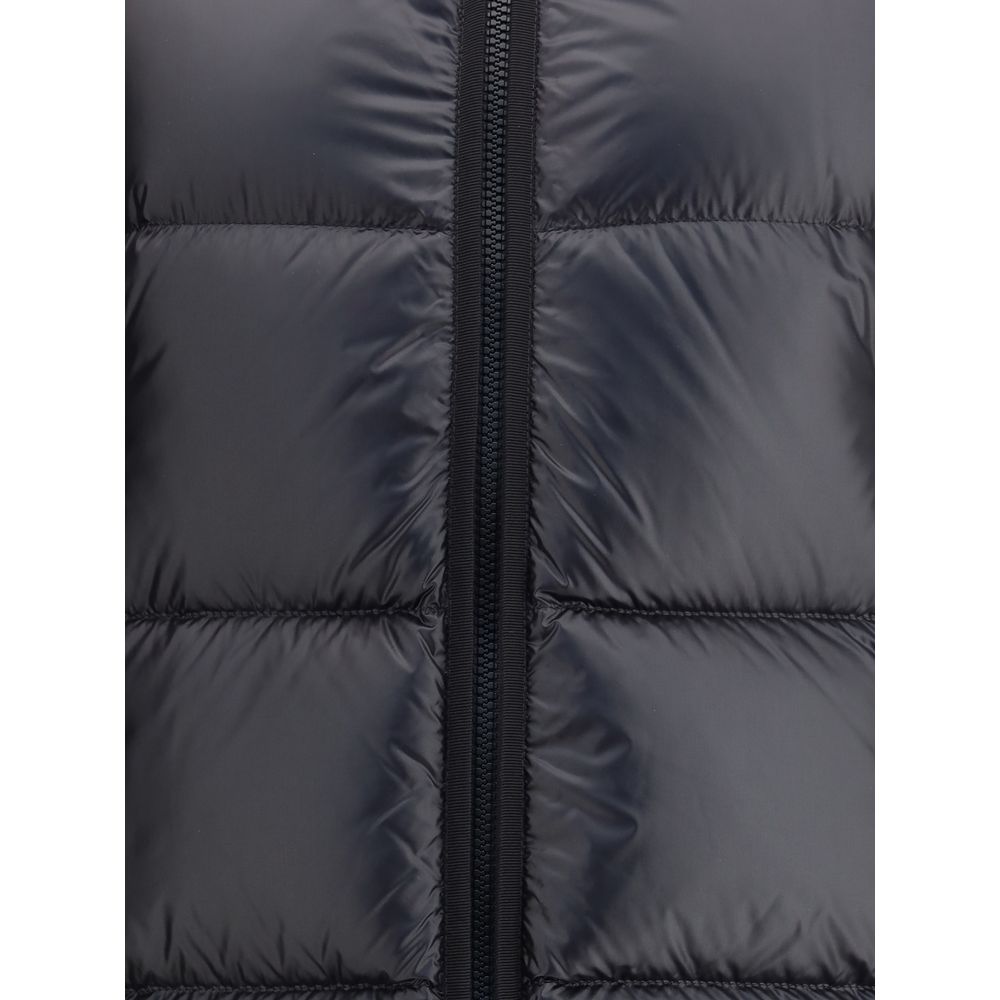 The Bady hooded short Down Jacket by Moncler is made of shiny laqué nylon with warm and comfortable padding. The model features a removable snap-button hood that can be adjusted with elastic drawstring, a flap patch pocket on the sleeve, a zipper closure and zippered side pockets. Elasticized and adjustable cuffs complete the design, combining functionality and iconic style.